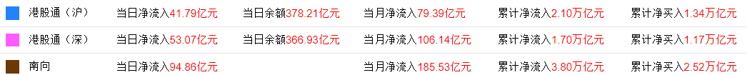 今日,南向资金方面,南下资金净流入94.85亿港元,其中港股通(沪)净流入41.78亿港元,港股通(深)净流入53.07亿港元。