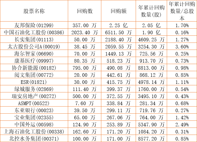 宝业集团(02355)、酷派集团(02369)、ASMPT(00522)、中国石油化工股份(00386)、中国外运(00598)、阅文集团(00772)、新鸿基公司(00086)、瑞安房地产(00272)、东亚银行(00023)、绿城服务(02869)、摩比发展(00947)、和谐汽车(03836)、佐丹奴国际(00709)、天福(06868)、清科创业(01945)、惠理集团(00806)、祖龙娱乐(09990)、霭华押业信贷(01319)、昊海生物科技(06826)、澳优(01717)、首程控股(00697)、金利来集团(00533)、天伦燃气(01600)、民银资本(01141)、长实集团(01113)、港龙中国地产(06968)、北控水务集团(00371)、太古股份公司A(00019)、太古股份公司B(00087)、上海石油化工股份(00338)、创胜集团-B(06628)、汇量科技(01860)、友邦保险(01299)、ESR(01821)、东软教育(09616)、协合新能源(00182)、海尔智家(06690)、中远海运国际(00517)、康圣环球(09960)、移卡(09923)、赛生药业(06600)、康基医疗(09997)、知乎-W(02390)于2022年11月3日进行了回购。其中,回购金额最大的为友邦保险(01299),回购数量357.00 万,回购金额2.25 亿元。
