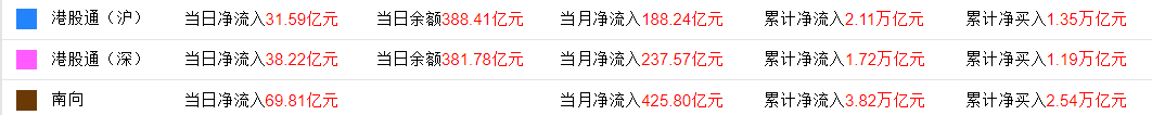 今日,南下资金净流入69.79亿港元,其中港股通(沪)净流入31.58亿港元,港股通(深)净流入38.21亿港元。