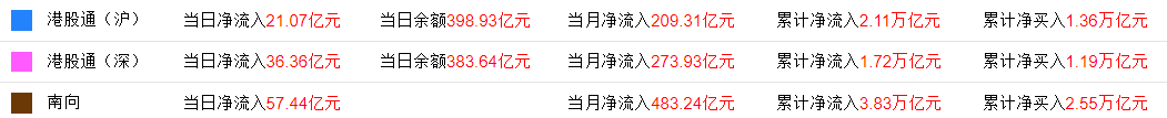 今日,南下资金净流入57.43亿港元,其中港股通(沪)净流入21.07亿港元,港股通(深)净流入36.36亿港元。