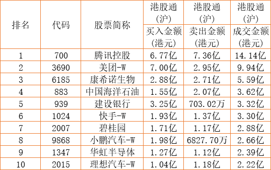 港股通(沪)买卖前十股(单位:港元):