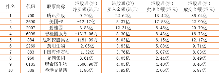 港股通(沪)买卖前十股(单位:港元):