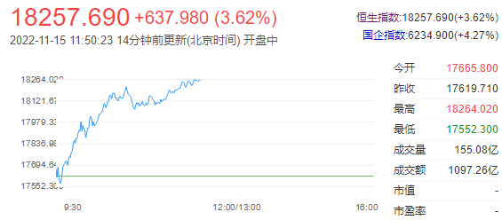港股上午盘三大指数呈单边上涨行情,恒生科技指数一马当先,午间大幅收涨6.81%,恒指、国指分别涨3.62%和4.27%,恒指重上18000点大关。