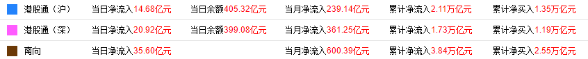今日,南下资金净流入35.6亿港元,其中港股通(沪)净流入14.68亿港元,港股通(深)净流入20.92亿港元。