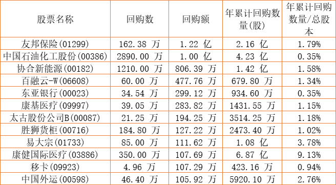 亿胜生物科技(01061)、摩比发展(00947)、清科创业(01945)、中国外运(00598)、东亚银行(00023)、富智康集团(02038)、康健国际医疗(03886)、朗生医药(00503)、天鸽互动(01980)、兴胜创建(00896)、上海石油化工股份(00338)、中国石油化工股份(00386)、北控水务集团(00371)、天福(06868)、胜狮货柜(00716)、太古股份公司A(00019)、太古股份公司B(00087)、天伦燃气(01600)、中远海运国际(00517)、易大宗(01733)、友邦保险(01299)、东软教育(09616)、创胜集团-B(06628)、星盛商业(06668)、百融云-W(06608)、移卡(09923)、康圣环球(09960)、康基医疗(09997)、协合新能源(00182)于2022年11月16日进行了回购。其中,回购金额最大的为友邦保险(01299),回购数量162.38 万,回购金额1.22 亿元。