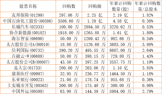 金利来集团(00533)、摩比发展(00947)、亿胜生物科技(01061)、胜狮货柜(00716)、兴胜创建(00896)、东亚银行(00023)、民银资本(01141)、天福(06868)、康健国际医疗(03886)、天鸽互动(01980)、清科创业(01945)、天伦燃气(01600)、信利国际(00732)、太古股份公司A(00019)、上海石油化工股份(00338)、易大宗(01733)、太古股份公司B(00087)、东软教育(09616)、中远海运国际(00517)、长城汽车(02333)、北控水务集团(00371)、创胜集团-B(06628)、百融云-W(06608)、汇量科技(01860)、友邦保险(01299)、移卡(09923)、海尔智家(06690)、星盛商业(06668)、康圣环球(09960)、康基医疗(09997)、协合新能源(00182)、ESR(01821)、上实城市开发(00563)、知乎-W(02390)于2022年11月17日进行了回购。其中,回购金额最大的为友邦保险(01299),回购数量297.06 万,回购金额2.25 亿元。