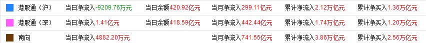 今日,南下资金净流入0.48亿港元,其中港股通(沪)净流入-0.92亿港元,港股通(深)净流入1.40亿港元。