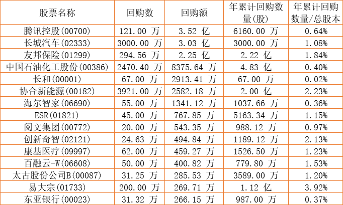 晨讯科技(02000)、中国石油化工股份(00386)、北控水务集团(00371)、百融云-W(06608)、长城汽车(02333)、富智康集团(02038)、中国外运(00598)、天福(06868)、腾讯控股(00700)、东亚银行(00023)、天鸽互动(01980)、金利来集团(00533)、民银资本(01141)、创新奇智(02121)、长和(00001)、康健国际医疗(03886)、天伦燃气(01600)、信利国际(00732)、胜狮货柜(00716)、太古股份公司A(00019)、太古股份公司B(00087)、清科创业(01945)、上海石油化工股份(00338)、彩客新能源(01986)、汇量科技(01860)、协合新能源(00182)、东软教育(09616)、中远海运国际(00517)、创胜集团-B(06628)、移卡(09923)、友邦保险(01299)、易大宗(01733)、海尔智家(06690)、星盛商业(06668)、摩比发展(00947)、康圣环球(09960)、阅文集团(00772)、康基医疗(09997)、ESR(01821)、上实城市开发(00563)、知乎-W(02390)于2022年11月18日进行了回购。其中,回购金额最大的为腾讯控股(00700),回购数量121.00 万,回购金额3.52 亿元。