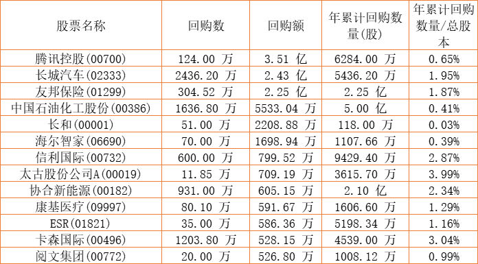 晨讯科技(02000)、和谐汽车(03836)、天福(06868)、摩比发展(00947)、酷派集团(02369)、亿胜生物科技(01061)、长城汽车(02333)、东亚银行(00023)、中国石油化工股份(00386)、金利来集团(00533)、信利国际(00732)、百融云-W(06608)、腾讯控股(00700)、民银资本(01141)、卡森国际(00496)、胜狮货柜(00716)、太古股份公司A(00019)、天伦燃气(01600)、太古股份公司B(00087)、佐丹奴国际(00709)、康健国际医疗(03886)、长和(00001)、移卡(09923)、友邦保险(01299)、清科创业(01945)、赛生药业(06600)、阅文集团(00772)、东软教育(09616)、易大宗(01733)、美亨实业(01897)、协合新能源(00182)、康圣环球(09960)、海尔智家(06690)、ESR(01821)、康基医疗(09997)、上实城市开发(00563)于2022年11月21日进行了回购。其中,回购金额最大的为腾讯控股(00700),回购数量124.00 万,回购金额3.51 亿元。