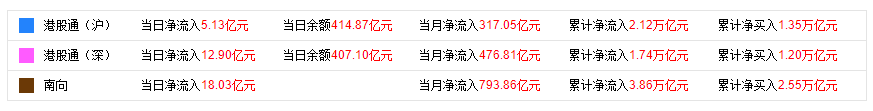 今日,南下资金净流入18.03亿港元,其中港股通(沪)净流入5.13亿港元,港股通(深)净流入12.90亿港元。