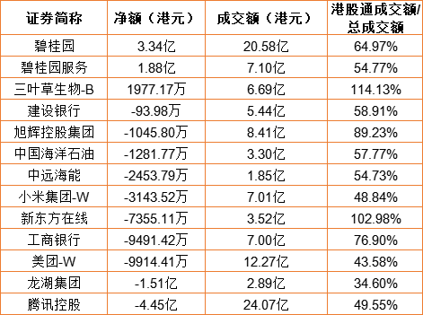 亚汇网11月24日港股通数据统计显示:碧桂园净买入额居首,达3.34亿港元,腾讯控股净卖出额居第一位。(亚汇网编辑:陌尘)
