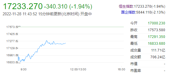 港股上午盘低开高走,恒生科技指数盘初一度跌超5%,午间收跌2.28%,3400点失而复得,恒指、国指分别跌1.98%和2.16%,恒指一度下破17000点。