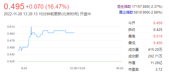 今日走势分析:南旋控股(01982)绩后大涨20%,盘中股价一度触及0.51港元,创自今年2月份中旬以来新高。截至发稿,涨16.47%,报0.495港元,成交额141.37万港元。