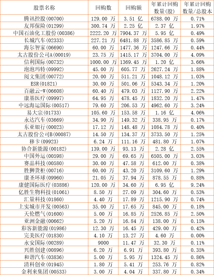摩比发展(00947)、亿胜生物科技(01061)、阅文集团(00772)、亚洲金融(00662)、东亚银行(00023)、彩星集团(00635)、和谐汽车(03836)、金利来集团(00533)、胜狮货柜(00716)、中国外运(00598)、天福(06868)、康健国际医疗(03886)、兴胜创建(00896)、新鸿基公司(00086)、信利国际(00732)、腾讯控股(00700)、民银资本(01141)、泡泡玛特(09992)、中国石油化工股份(00386)、百融云-W(06608)、天伦燃气(01600)、长城汽车(02333)、太古股份公司A(00019)、太古股份公司B(00087)、赛晶科技(00580)、友邦保险(01299)、完美医疗(01830)、彩客新能源(01986)、酷派集团(02369)、清科创业(01945)、易大宗(01733)、汇量科技(01860)、海尔智家(06690)、中远海运国际(00517)、移卡(09923)、永达汽车(03669)、协合新能源(00182)、康圣环球(09960)、上实城市开发(00563)、康基医疗(09997)、ESR(01821)于2022年11月25日进行了回购。其中,回购金额最大的为腾讯控股(00700),回购数量129.00 万,回购金额3.51 亿元。
