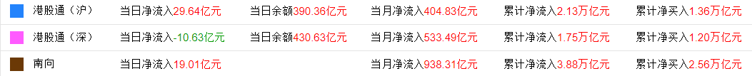 今日,南下资金净流入19.01亿港元,其中港股通(沪)净流入29.63亿港元,港股通(深)净流出10.62亿港元。