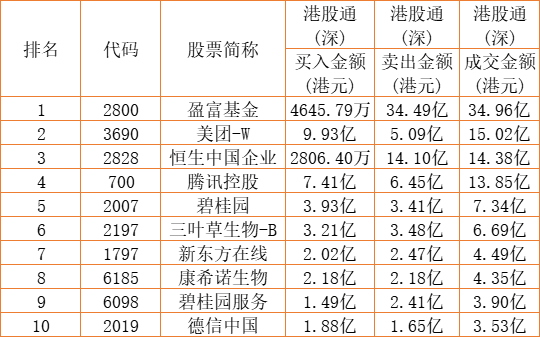 港股通(深)买卖前十股(单位:港元):