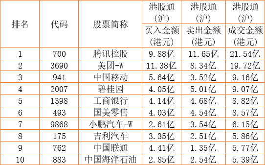 港股通(沪)买卖前十股(单位:港元):