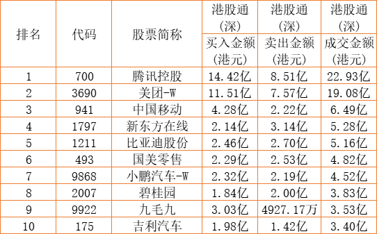 港股通(深)买卖前十股(单位:港元):