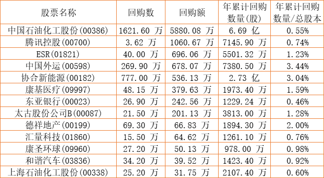 富智康集团(02038)、摩比发展(00947)、德祥地产(00199)、亿胜生物科技(01061)、天福(06868)、中国石油化工股份(00386)、DYNAM JAPAN(06889)、中国外运(00598)、亿都(国际控股)(00259)、腾讯控股(00700)、酷派集团(02369)、东亚银行(00023)、康健国际医疗(03886)、金利来集团(00533)、太古股份公司B(00087)、兴胜创建(00896)、汇量科技(01860)、清科创业(01945)、天伦燃气(01600)、上海石油化工股份(00338)、ESR(01821)、康圣环球(09960)、康基医疗(09997)、协合新能源(00182)、圣诺医药-B(02257)于2022年12月1日进行了回购。其中,回购金额最大的为中国石油化工股份(00386),回购数量1621.60 万,回购金额5880.08 万元。