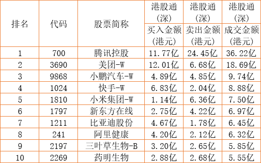 港股通(深)买卖前十股(单位:港元):