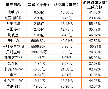 亚汇网12月5日港股通数据统计显示:快手-W净买入额居首,达6.53亿港元,腾讯控股净卖出额居第一位。(亚汇网编辑:陌尘)