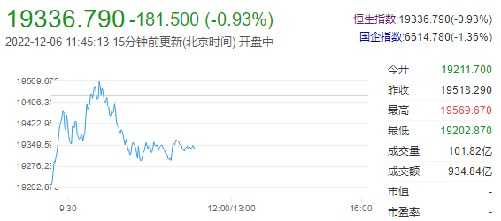港股三大指数集体回调,恒指午间收跌0.93%,恒科指跌1.92%,国指跌1.36%。南下资金半日净流入45.07亿港元,大市成交额为935亿港元。