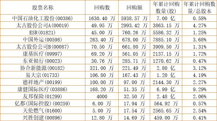 摩比发展(00947)、保发集团(03326)、中国石油化工股份(00386)、亿都(国际控股)(00259)、天福(06868)、东亚银行(00023)、兴胜创建(00896)、金利来集团(00533)、天伦燃气(01600)、清科创业(01945)、太古股份公司A(00019)、康健国际医疗(03886)、易大宗(01733)、太古股份公司B(00087)、中远海运国际(00517)、汇量科技(01860)、圣诺医药-B(02257)、友邦保险(01299)、协合新能源(00182)、康圣环球(09960)、ESR(01821)、上实城市开发(00563)、康基医疗(09997)于2022年12月5日进行了回购。其中,回购金额最大的为中国石油化工股份(00386),回购数量1630.40 万,回购金额5938.57 万元。