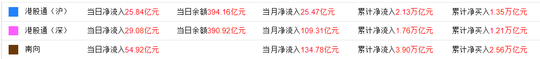 今日,南下资金净流入54.91亿港元,其中港股通(沪)净流出25.83亿港元,港股通(深)净流入29.08亿港元。