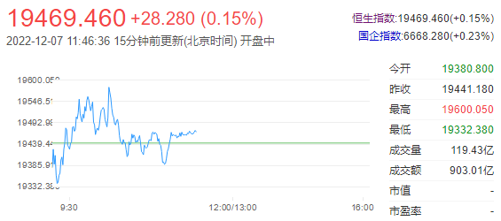港股三大指数午间集体收涨,恒指涨0.15%,恒科指涨1.37%,国指涨0.23%。南下资金半日净流入15.88亿港元,大市成交额为903亿港元。