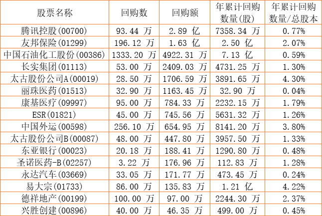 富智康集团(02038)、摩比发展(00947)、德祥地产(00199)、金利来集团(00533)、中国石油化工股份(00386)、亿都(国际控股)(00259)、东亚银行(00023)、天伦燃气(01600)、兴胜创建(00896)、中国外运(00598)、佐丹奴国际(00709)、友邦保险(01299)、蓝河控股(00498)、腾讯控股(00700)、长实集团(01113)、太古股份公司A(00019)、太古股份公司B(00087)、天福(06868)、清科创业(01945)、康健国际医疗(03886)、易大宗(01733)、丽珠医药(01513)、康圣环球(09960)、圣诺医药-B(02257)、ESR(01821)、康基医疗(09997)、永达汽车(03669)于2022年12月6日进行了回购。其中,回购金额最大的为腾讯控股(00700),回购数量93.44 万,回购金额2.89 亿元。