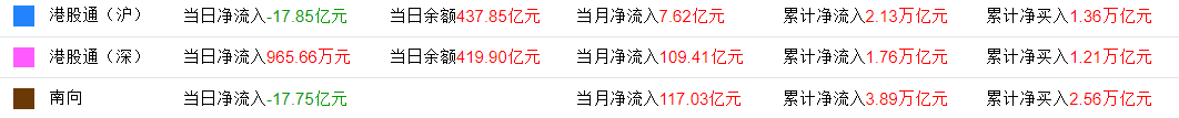 资金动向: 南向资金当日净流出17.75亿港元