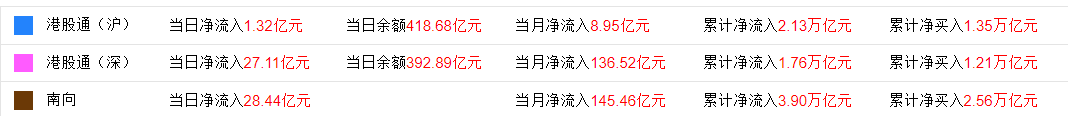 今日,南下资金净流出28.43亿港元,其中港股通(沪)净流入1.32亿港元,港股通(深)净流入27.11亿港元。