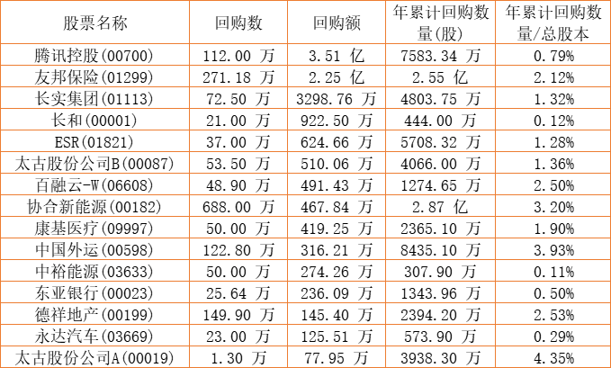 兴胜创建(00896)、中国外运(00598)、腾讯控股(00700)、朗生医药(00503)、金利来集团(00533)、新鸿基公司(00086)、胜狮货柜(00716)、美亨实业(01897)、清科创业(01945)、友邦保险(01299)、蓝河控股(00498)、天福(06868)、长和(00001)、中裕能源(03633)、康健国际医疗(03886)、太古股份公司A(00019)、长实集团(01113)、太古股份公司B(00087)、亿都(国际控股)(00259)、天伦燃气(01600)、ESR(01821)、百融云-W(06608)、筑友智造科技(00726)、永达汽车(03669)、北京能源国际(00686)、协合新能源(00182)、圣诺医药-B(02257)、康基医疗(09997)、上实城市开发(00563)于2022年12月8日进行了回购。其中,回购金额最大的为腾讯控股(00700),回购数量112.00 万,回购金额3.51 亿元。