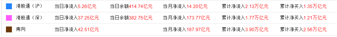 今日,南下资金净流出42.50亿港元,其中港股通(沪)净流入5.25亿港元,港股通(深)净流入37.25亿港元。