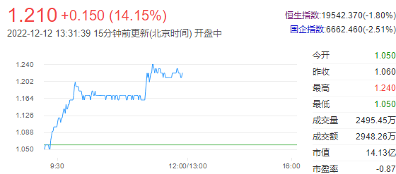 今日走势分析:协鑫新能源(00451)涨超13%,截至发稿,涨9.43%,报1.16港元,成交额1411.54万港元。