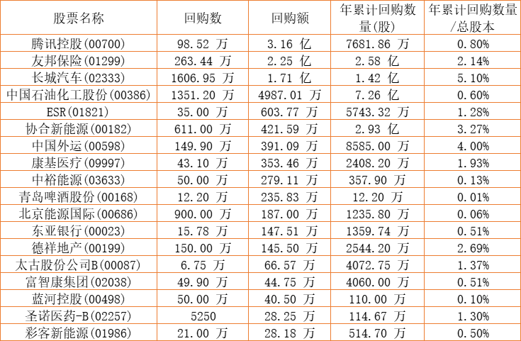 新鸿基公司(00086)、东亚银行(00023)、德祥地产(00199)、长城汽车(02333)、摩比发展(00947)、青岛啤酒股份(00168)、兴胜创建(00896)、中国石油化工股份(00386)、金利来集团(00533)、亿都(国际控股)(00259)、中国外运(00598)、天福(06868)、腾讯控股(00700)、康健国际医疗(03886)、蓝河控股(00498)、天伦燃气(01600)、太古股份公司B(00087)、清科创业(01945)、中裕能源(03633)、友邦保险(01299)、移卡(09923)、彩客新能源(01986)、永达汽车(03669)、北京能源国际(00686)、上实城市开发(00563)、康基医疗(09997)、ESR(01821)、圣诺医药-B(02257)、协合新能源(00182)于2022年12月9日进行了回购。其中,回购金额最大的为腾讯控股(00700),回购数量98.52 万,回购金额3.16 亿元。