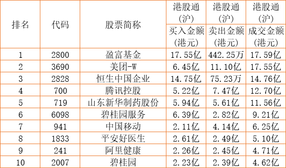 港股通(沪)买卖前十股(单位:港元):