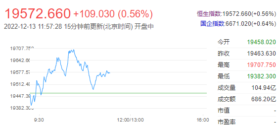 港股早上小幅低开5点后,曾再扩大跌幅至最多跌81点,低见19382。随后港府公布明日开始取消“安心出行”,而内地亦同步公布明年1月可通行的流程。市场憧憬疫情措施正逐步取消,社会、经济及生活等都会回复正常。股市即见反弹造好,恒指高见19707,最多升244点。恒生科技指数(4226.89 34.22 0.82%)亦同步造好,高见4279,最多升86点。但消息早前已消化大部份,因此升幅有限,加上市场聚焦在美国今晚的通胀数据及明晚议息结果。成交亦见减少。