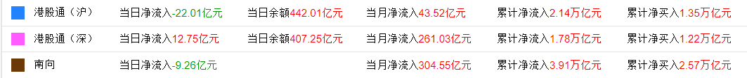今日,南下资金净流出9.26亿港元,其中港股通(沪)净流出22.01亿港元,港股通(深)净流入12.75亿港元。