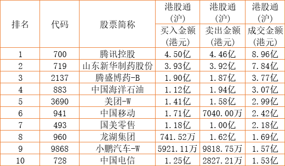亚汇网实时数据统计:截至12月21日收盘,腾讯控股、山东新华制药股份、腾盛博药-B位居港股通(沪)成交前三,新东方在线、美团-W、腾讯控股位居股通(深)成交前三。