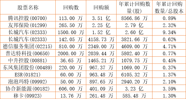 亿胜生物科技(01061)、泡泡玛特(09992)、天福(06868)、中国外运(00598)、亿都(国际控股)(00259)、民银资本(01141)、摩比发展(00947)、蓝河控股(00498)、兴胜创建(00896)、东风集团股份(00489)、龙资源(01712)、东亚银行(00023)、清科创业(01945)、新鸿基公司(00086)、天伦燃气(01600)、长城汽车(02333)、腾讯控股(00700)、太古股份公司B(00087)、普达特科技(00650)、上海石油化工股份(00338)、友邦保险(01299)、康健国际医疗(03886)、汇量科技(01860)、完美医疗(01830)、永达汽车(03669)、长城汽车(02333)、易大宗(01733)、移卡(09923)、中升控股(00881)、美亨实业(01897)、协合新能源(00182)、ESR(01821)、圣诺医药-B(02257)、上实城市开发(00563)、康基医疗(09997)于2022年12月21日进行了回购。其中,回购金额最大的为腾讯控股(00700),回购数量113.00 万,回购金额3.51 亿元。