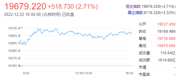 受隔夜美股上涨及内地政策利好影响,港股三大指数全天表现强势,恒生科技指数早盘一度涨5.2%,收涨4.61%,恒指、国指分别涨2.71%和3.33%,恒指上扬超500点。港股后市展望,随着海外投资者对国内政策预期的逐步扭转,外资在2023年有望持续回流港股;而海外的流动性预期转向亦有助美股重拾升势。展望2023年,国内防疫政策的进一步优化,叠加地产信用风险的逐步化解将共同带动经济基本面预期逐步企稳,改善港股市场投资者的风险偏好。