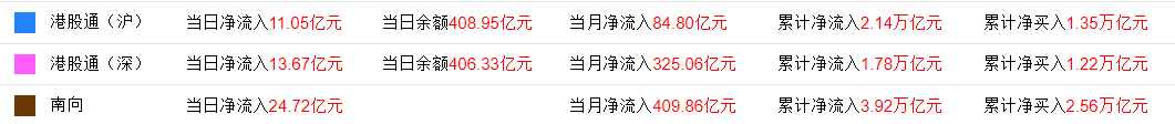 今日,南下资金净流入24.7亿港元,港股通(沪)净流入11.04亿港元,港股通(深)净流入13.66亿港元。