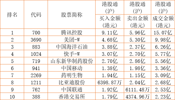 港股通(沪)买卖前十股(单位:港元):