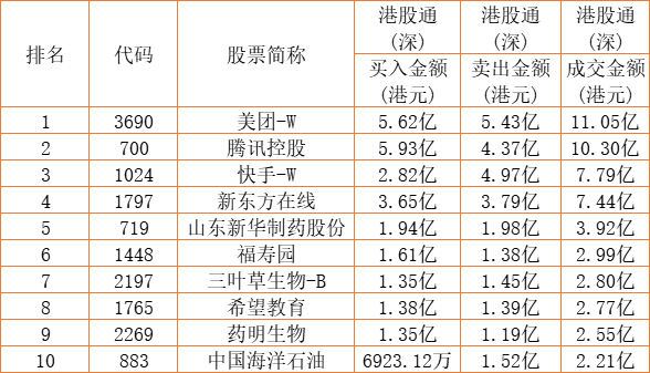 港股通(深)买卖前十股(单位:港元):