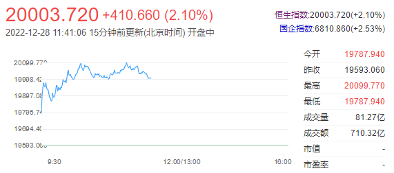 港股上午盘高开高走,恒指涨2.14%重回2万点上方,且刷新阶段新高,国指涨2.59%,恒生科技指数涨2.72%。