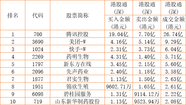 港股通(深)买卖前十股(单位:港元):