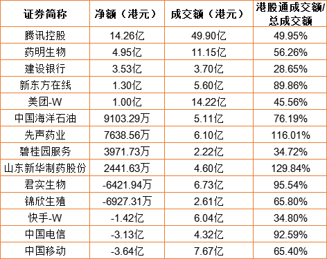 亚汇网12月29日港股通数据统计显示:腾讯控股净买入额居首,达14.26亿港元,中国移动(600941)净卖出额居第一位。(亚汇网编辑:陌尘)