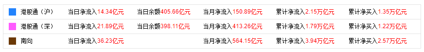 资金动向: 南向资金当日净买入36.23亿港元