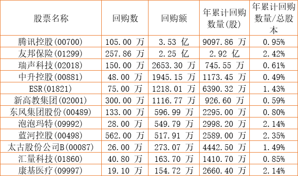 富智康集团(02038)、东风集团股份(00489)、中国外运(00598)、亿都(国际控股)(00259)、清科创业(01945)、兴胜创建(00896)、泡泡玛特(09992)、天福(06868)、腾讯控股(00700)、龙资源(01712)、蓝河控股(00498)、创新奇智(02121)、太古股份公司B(00087)、康健国际医疗(03886)、瑞声科技(02018)、新高教集团(02001)、阳光纸业(02002)、汇量科技(01860)、天伦燃气(01600)、友邦保险(01299)、北京能源国际(00686)、康圣环球(09960)、中升控股(00881)、永达汽车(03669)、ESR(01821)、康基医疗(09997)、圣诺医药-B(02257)于2022年12月30日进行了回购。其中,回购金额最大的为腾讯控股(00700),回购数量105.00 万,回购金额3.53 亿元。